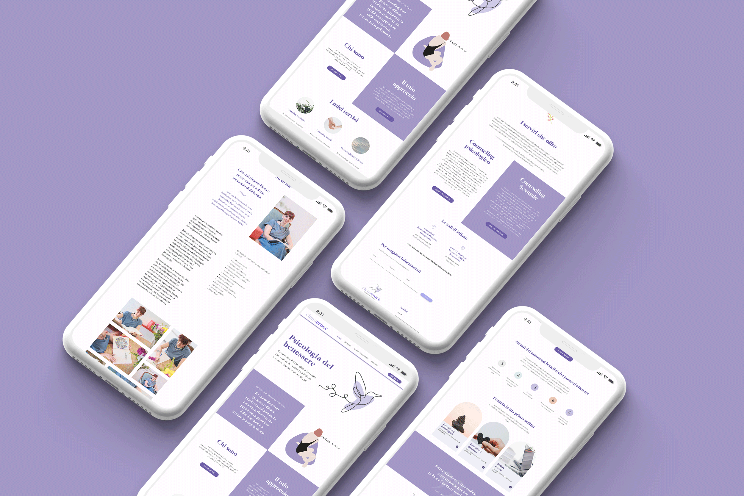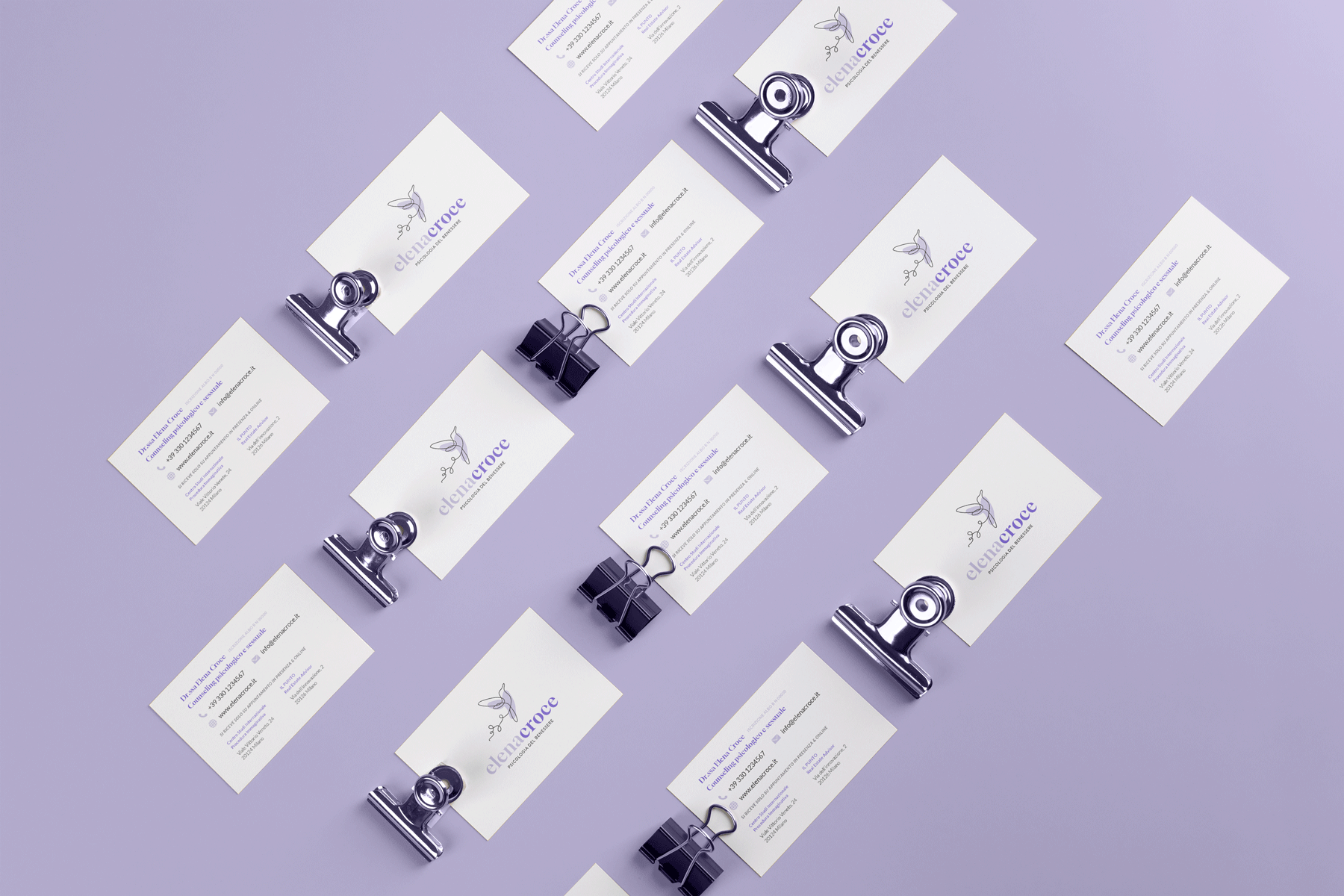 Progetto di identità visiva per l'attività di Elena, Dottoressa in Tecniche Psicologiche specializzata in Counseling Psicologico e Sessuale. Con Elena abbiamo sviluppato tutto il progetto di branding, progettando il logotipo, il pittogramma, i biglietti da visita e anche il suo sito web.