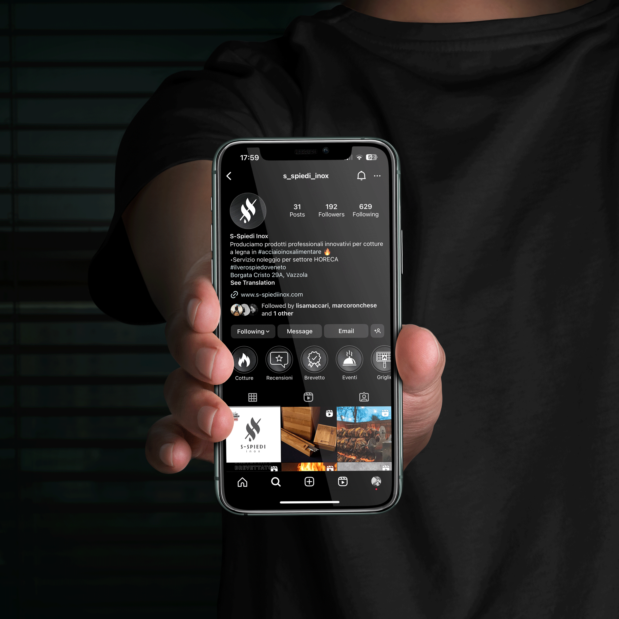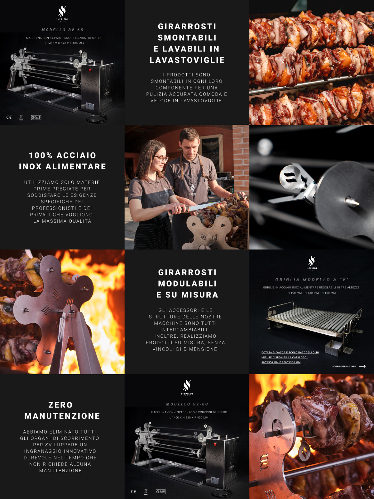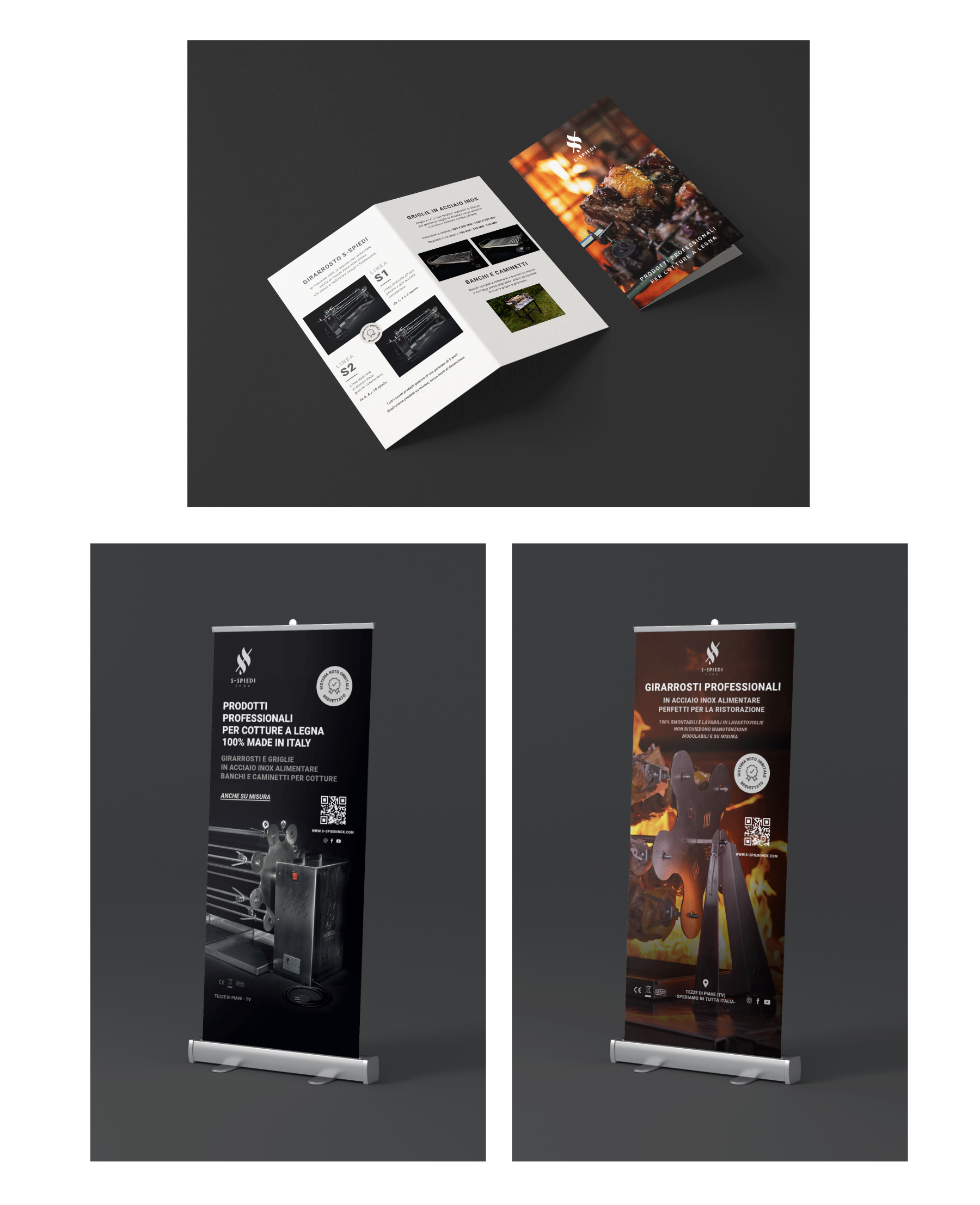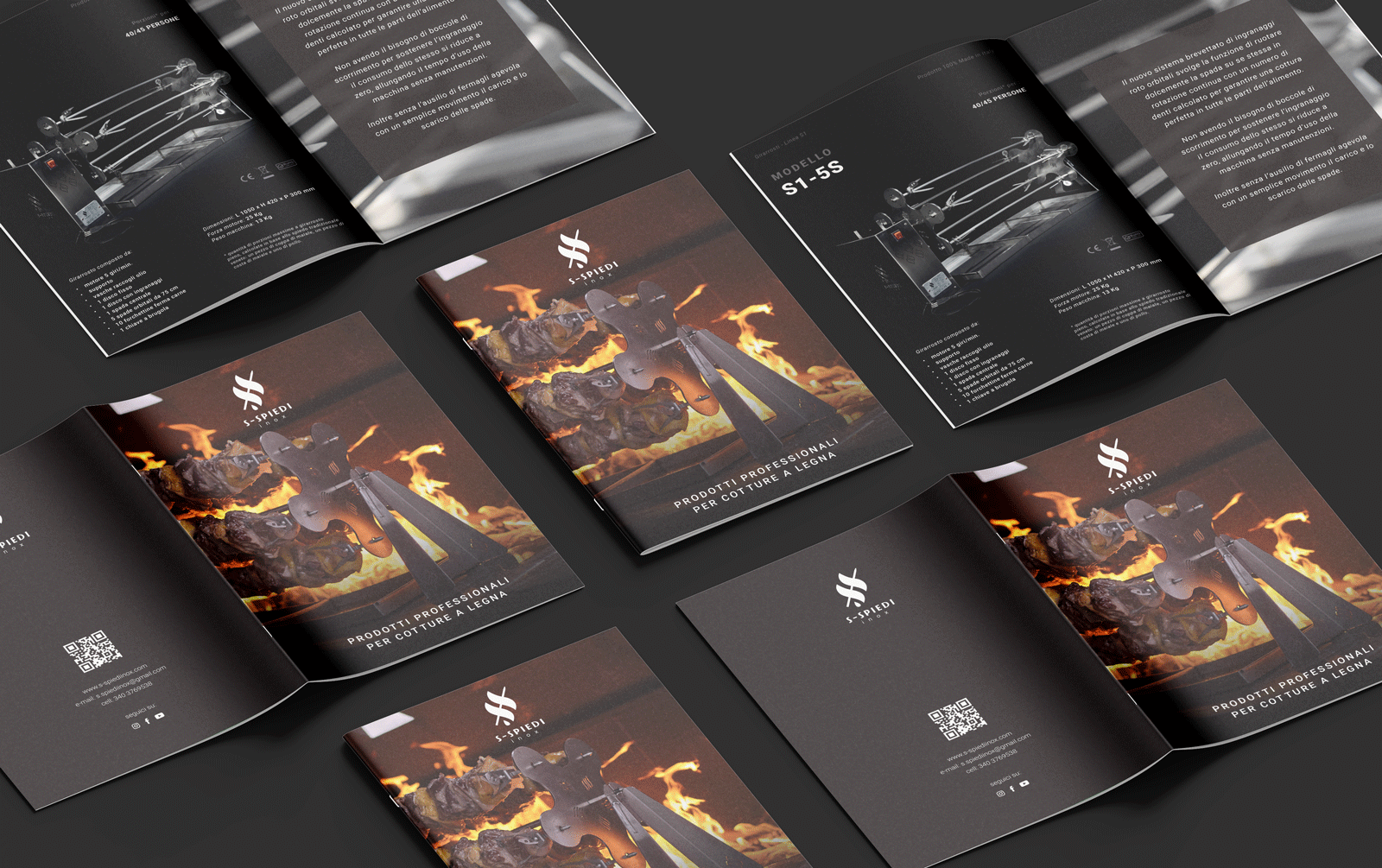 S-Spiedi Inox è un’azienda che si rivolge principalmente al mondo del settore Horeca, quindi abbiamo voluto creare un’identità visiva che veicolasse un’immagine professionale, elegante e moderna. I colori scuri, che già erano stati individuati nello sviluppo del marchio e ben si sposano con il materiale metallico da loro utilizzato, e i font - rigorosamente sans-serif - sono gli elementi chiave che abbiamo scelto per avere un linguaggio visivo coerente con il posizionamento del brand.
